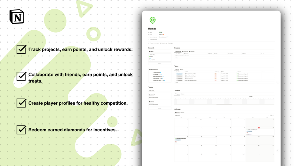 - Avatars Page: The Avatars Page allows you to add and create multiple player profiles, turning your productivity journey into a collaborative and competitive experience. Each player gets their dedicated workspace within the template, where they can keep track of their personal projects, tasks, and accumulated rewards. This fosters a sense of camaraderie and healthy competition among participants, encouraging everyone to stay focused and productive.